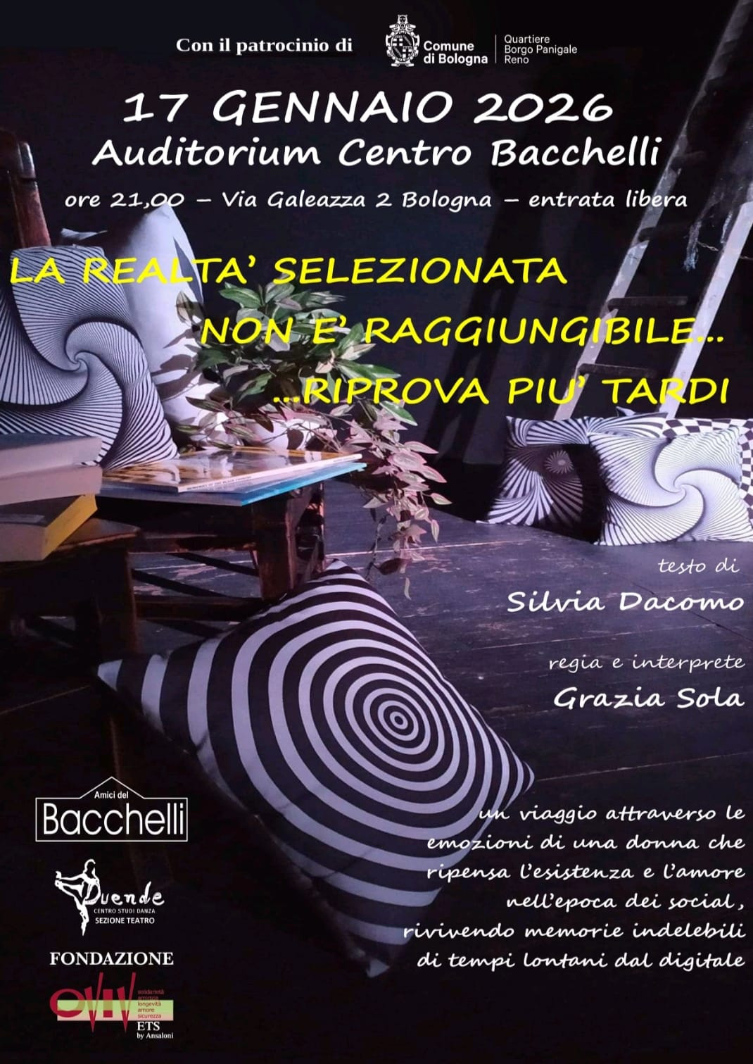 Centro Bacchelli Via Galeazza 2, Bologna, ItalyUn viaggio attraverso le emozioni di una donna che ripensa l'esistenza e l'amore nell'epoca dei social, rivivendo memorie indelebili di tempi lontani dal digitale.